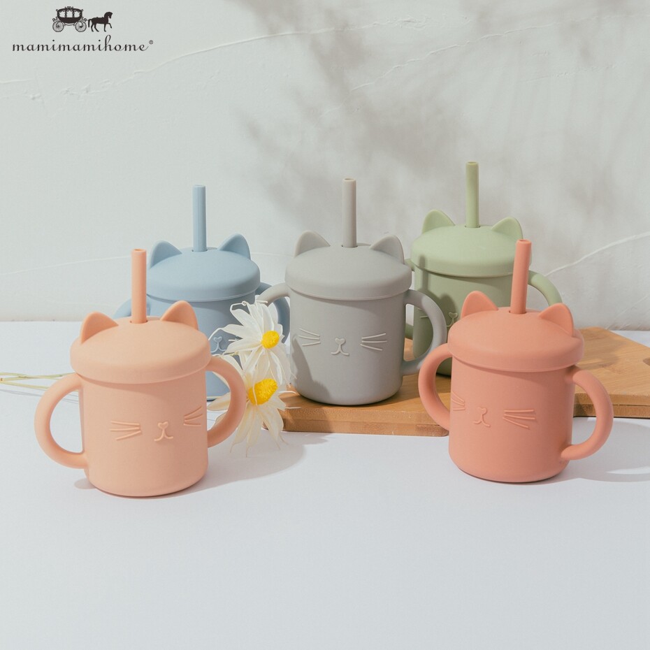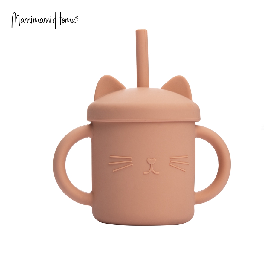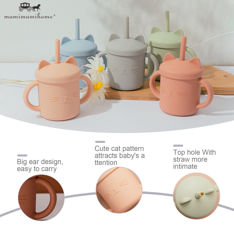Mamimami Home Kids Sippy Cup 1PC 100% Food Grade Silicone Cups with Straw & Cover Cartoon Cat Baby Self-feeding Essentials