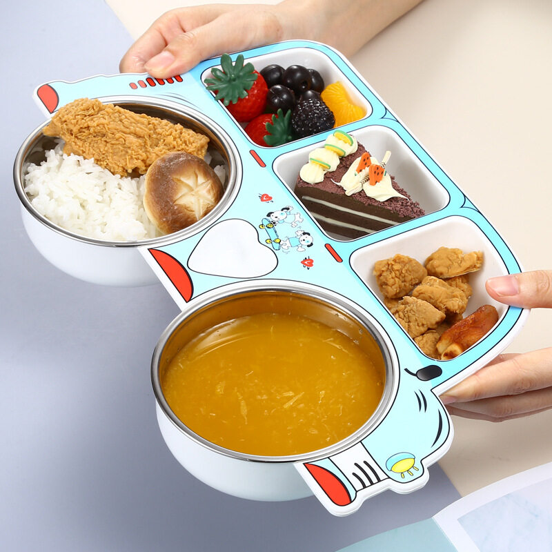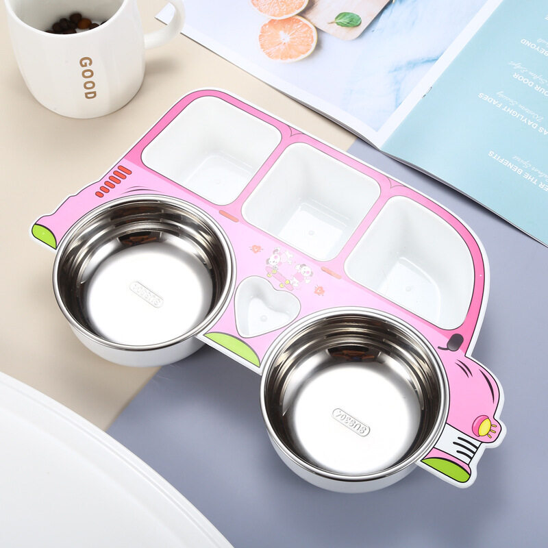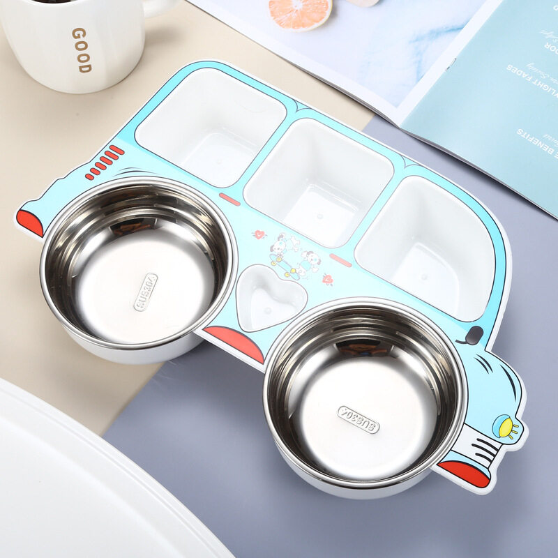 Kocotree Safe stainless steel children's dinner plate 304 stainless steel Cartoon car shape Baby food supplement tableware Anti-scalding partition design Kindergarten gift sets