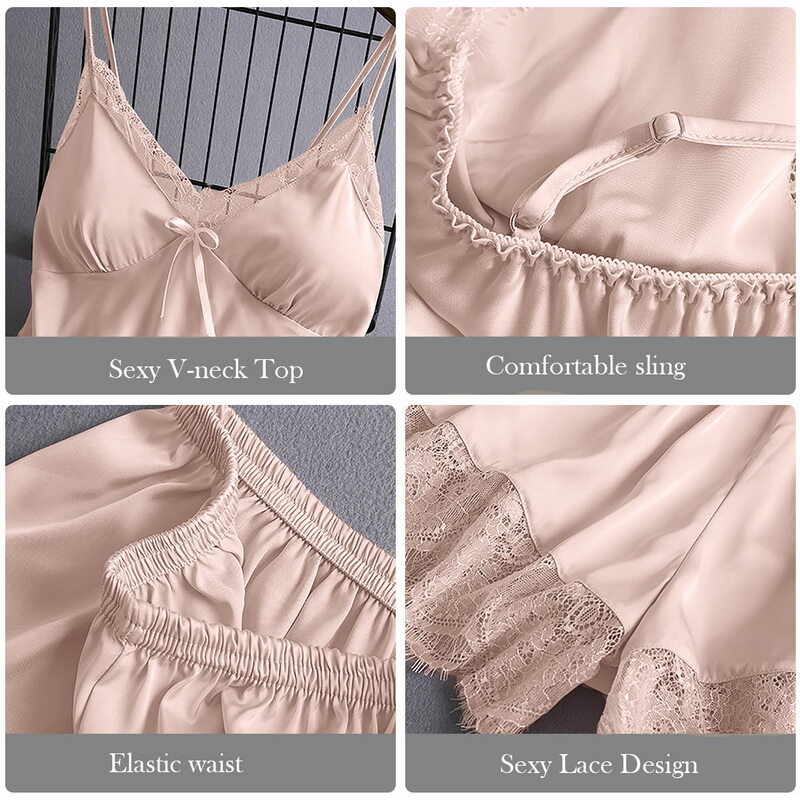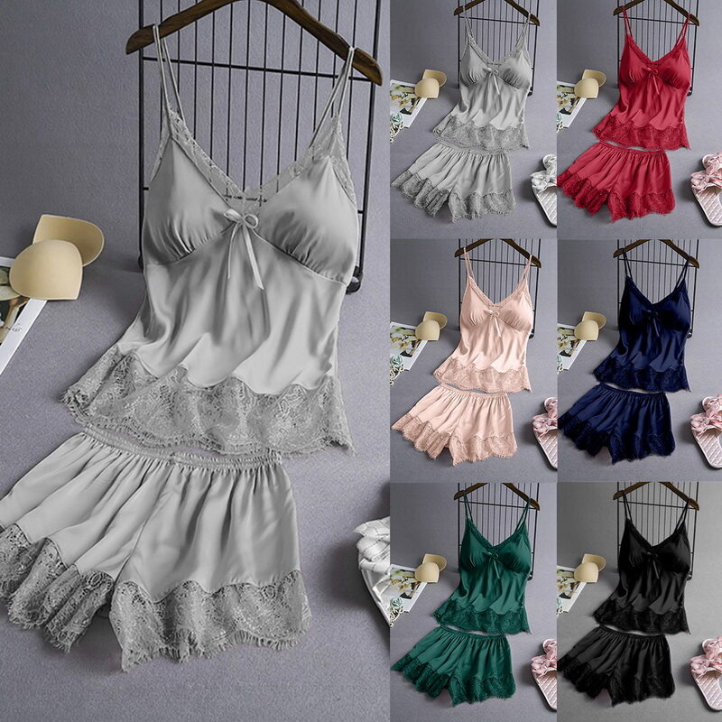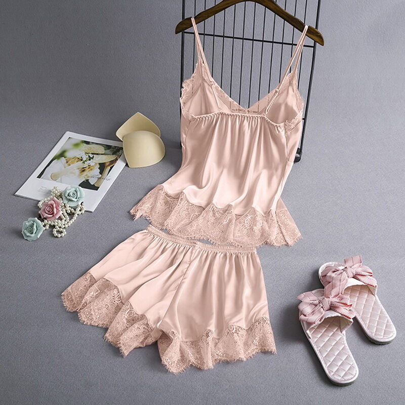 Features:Women Pajamas Set Solid Color Sleepwear Lace Camisole High Waist Short Two-piece Set Silk Home WearNotice:For manual measurement, please allow 1-3cm error Size:S-3XLColor:black,blue,pink,gray,green,redMaterial:satin + eyelash lacePackage Includes:a pcs Pajamas SetCare instructions: Hand washing is recommendedSize: please allow 1-2cm differs due to manual measurement, thanks.Note: Due to the difference between different monitors, the picture may not reflect the actual color of the item. We guarantee the style is the same as shown in the pictures, but not the same performance on different bodies as on the model. Thank you!