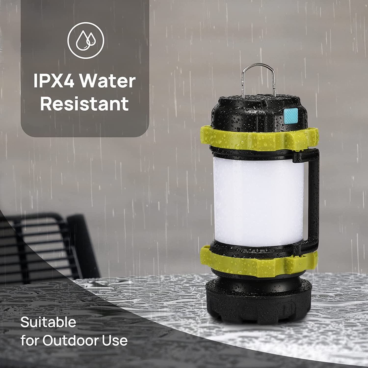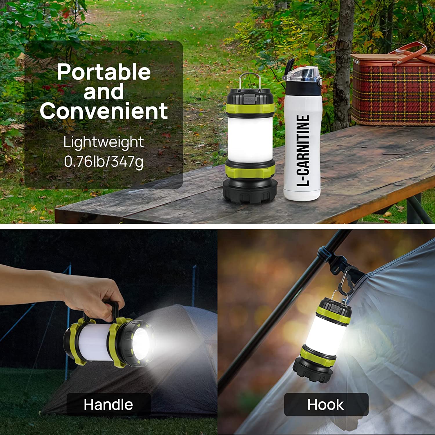 Shorter and smaller than an outdoor bottle, weighed no more than 347g (0.74lb), this portable LED camping lantern is easy to carry and pack. It is designed with a carry handle and two-way hook. You can hang it on tent, backpack, and branches. Free your hand and save your space.