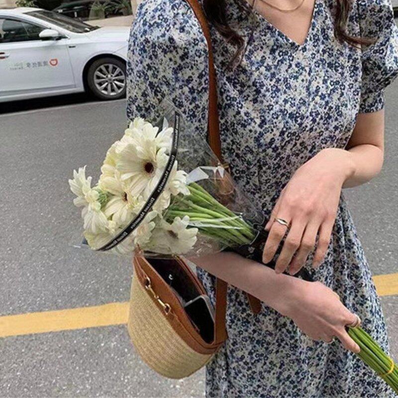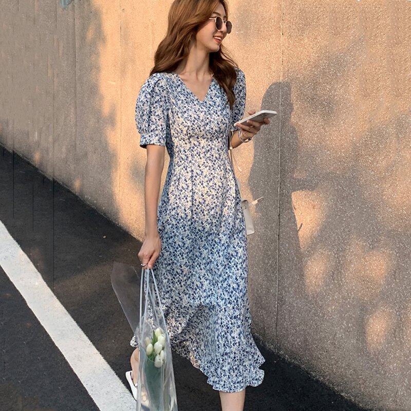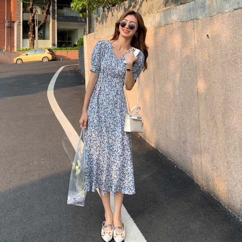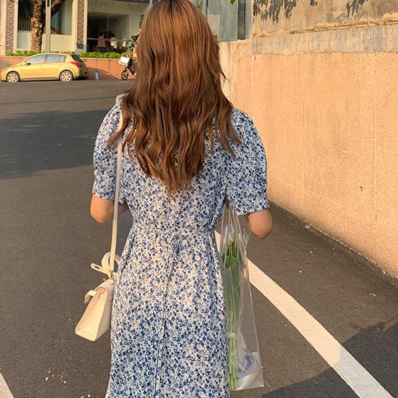 INWPLLR Freach Sryle Puff Sleeve Dresses Women Chic Ins Midi Floral Dress Korean Tight V-neck Dress For Ladies