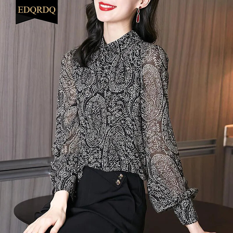 EDQRDQ Women's Floral Print Long Sleeve High Neck Plus Size Georgette Chiffon Blouse