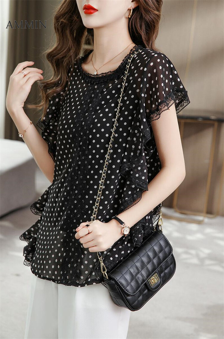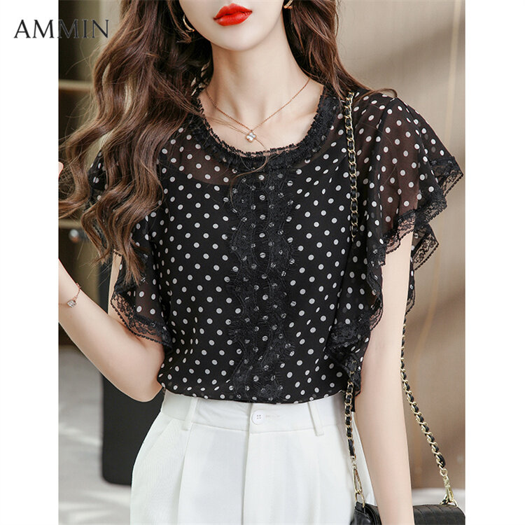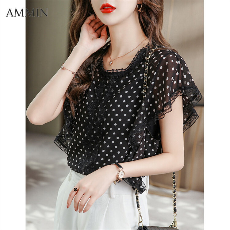 AMMIN Korean style women's short-sleeved polka-dot print lace chiffon shirt 2022 new loose fashion Western style flounce off-the-shoulder lace chiffon top