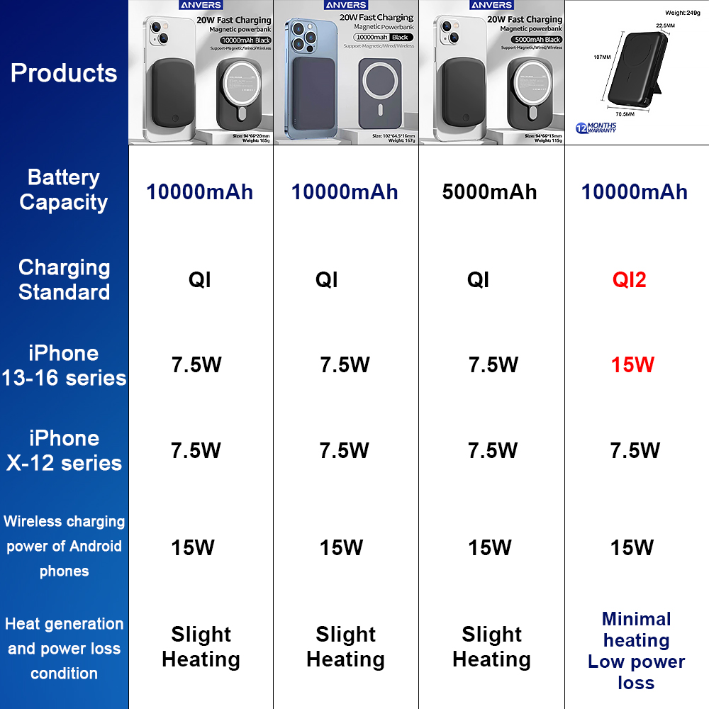 - **Wireless Output**: 7.5W (Qi2) for iphone 13-16,15W for Android
