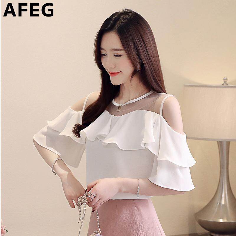 AFEG Summer New Solid Color Korean Round Collar Off Shoulder Camp Ruffle Fashion Loose Elegant Elegant Temperament Mesh Stitching Chiffon Trumpet Short Sleeve Top
