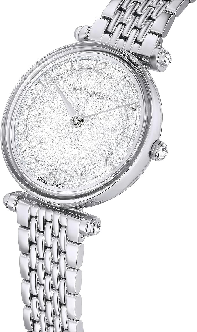 • Exquisite style: Featuring a white silver-tone dial embellished with Arabic numerals and approximately 1,000 crystals, this watch allows for maximum sparkle in the way that only Swarovski crystals can