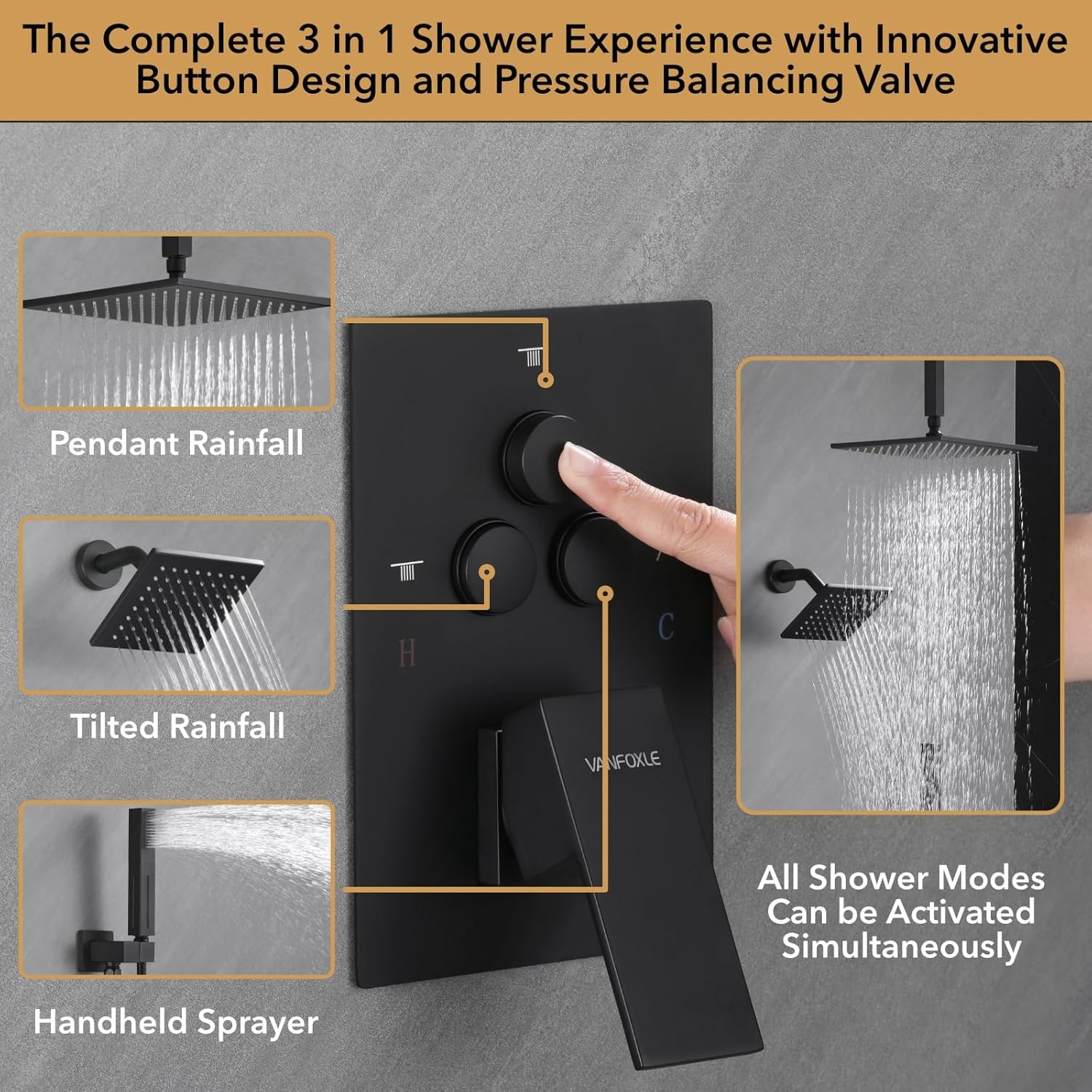 Push-button Diverter: Vanfoxle has developed an improved water control version – replacing the traditional square controller with a push-button diverter. The new mechanism ensures users won't accidentally switch to the wrong mode with a slippery hand. Furthermore, with the help of the new button design, users can simultaneously activate three shower modes: a wall-mounted shower mode and a handheld shower spray, creating their preferred shower experience.